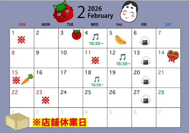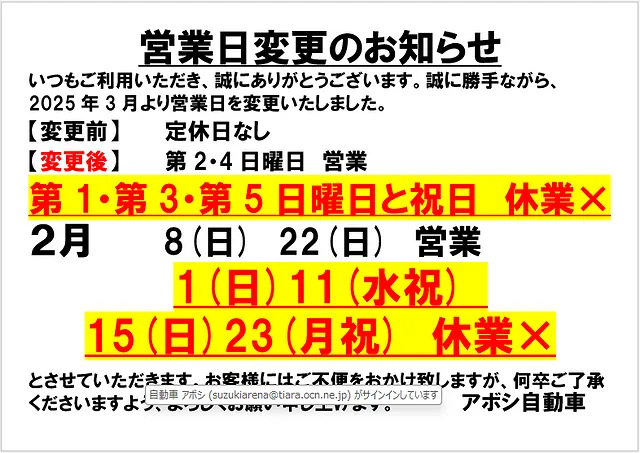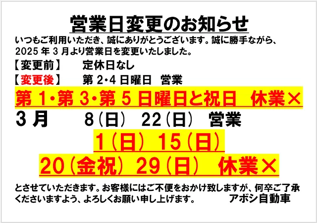 誠に勝手ながら、3月より当面の間、営業日を変更いたします。